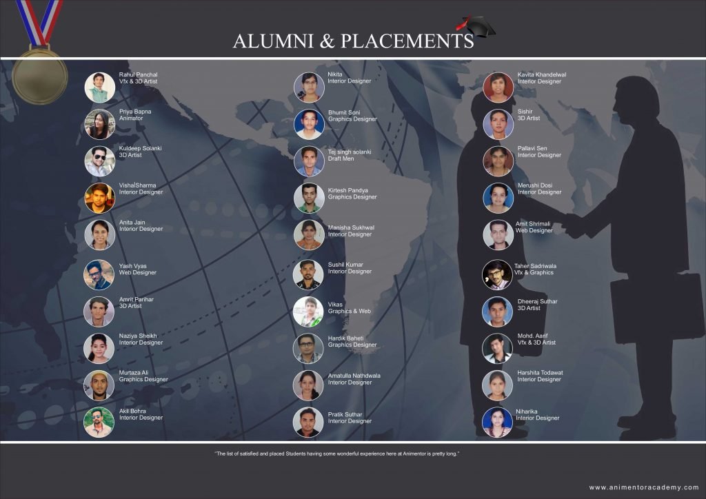 Animentor has highest number of placement records from the years of its existence. Our students have been placed among some of the top studios, production house, advertising agency, architects Firms & corporate houses in india and overseas. Animentor has always aimed at creating top creative talents by carving a path for their successful future & career. Placement cell at animentor has been working towards creating new job offers for passing out student every Year. On successfully completing a career course with Animentor, you are eligible for job placement assistance from the institute itself.